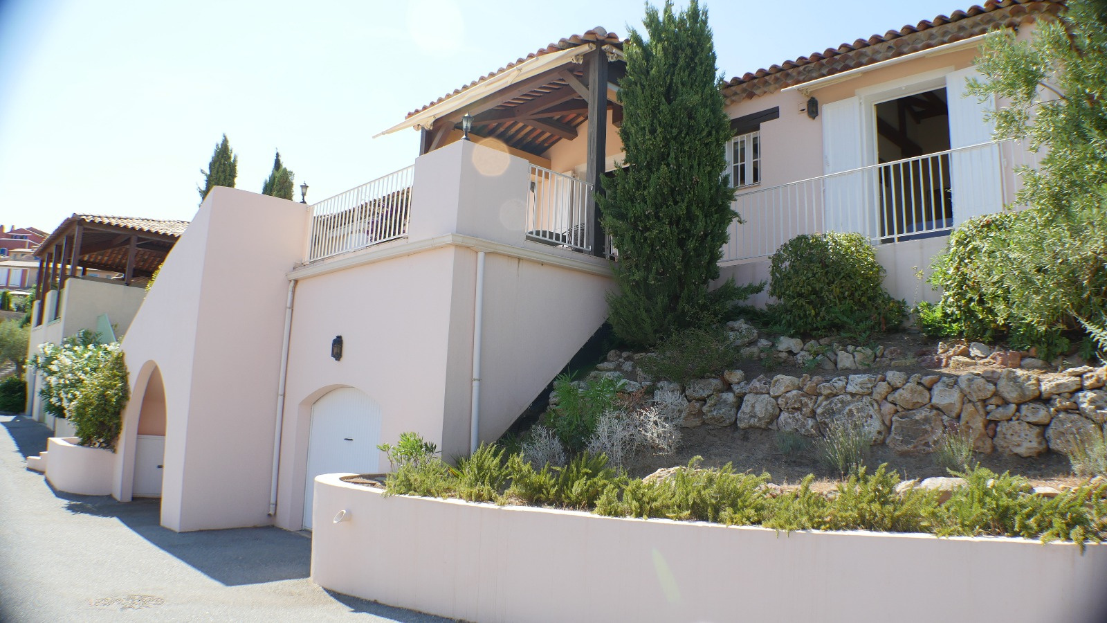 VUE MER PANORAMIQUE. Villa type Bastide offrant de plain-pied: double séjour avec cheminée avec accès direct sur une grande terrasse, cuisine semi-ouverte aménagée, une chambre parentale avec salle de bains, 2 autres chambres, une salle de douche. En sous-sol: grand garage pour plusieures voitures, espace rangements. Le tout en parfait état. Domaine privé et sécurisé avec tennis, piscine. Très bel environnement.