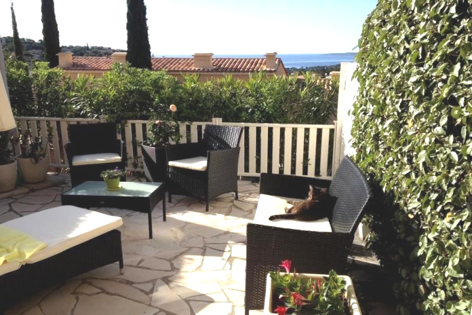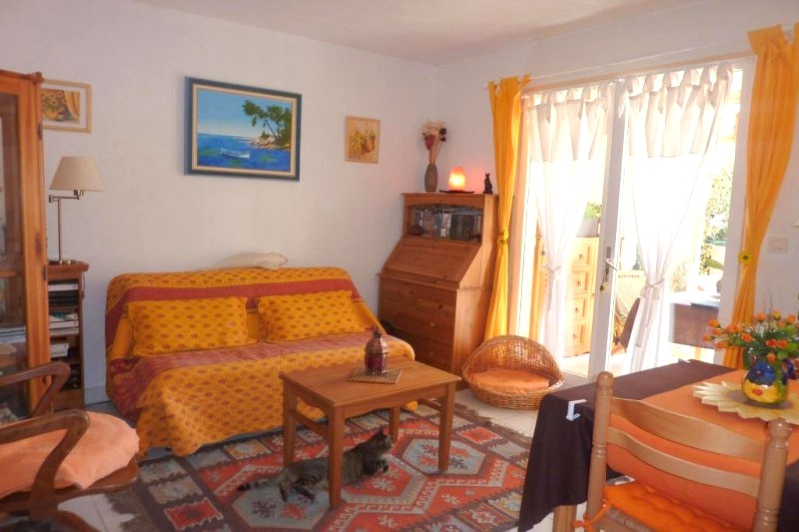 Magnifique appartement 2 pièces en rez de jardin offrant: séjour avec cuisine provençale aménagée, chambre , salle de bains, wc séparé. Belle loggia fermée - coin salle à manger. Jardin clos. Aperçu mer. Résidence avec piscines, tennis. Excellent état.