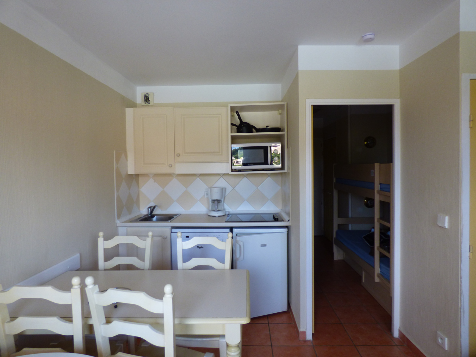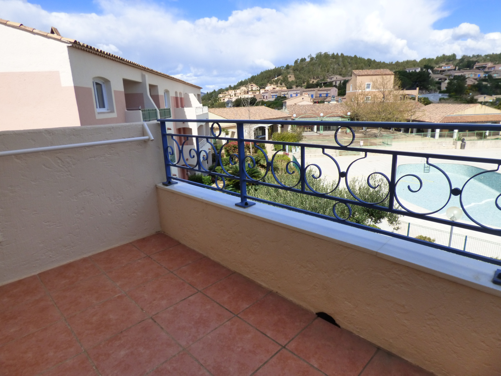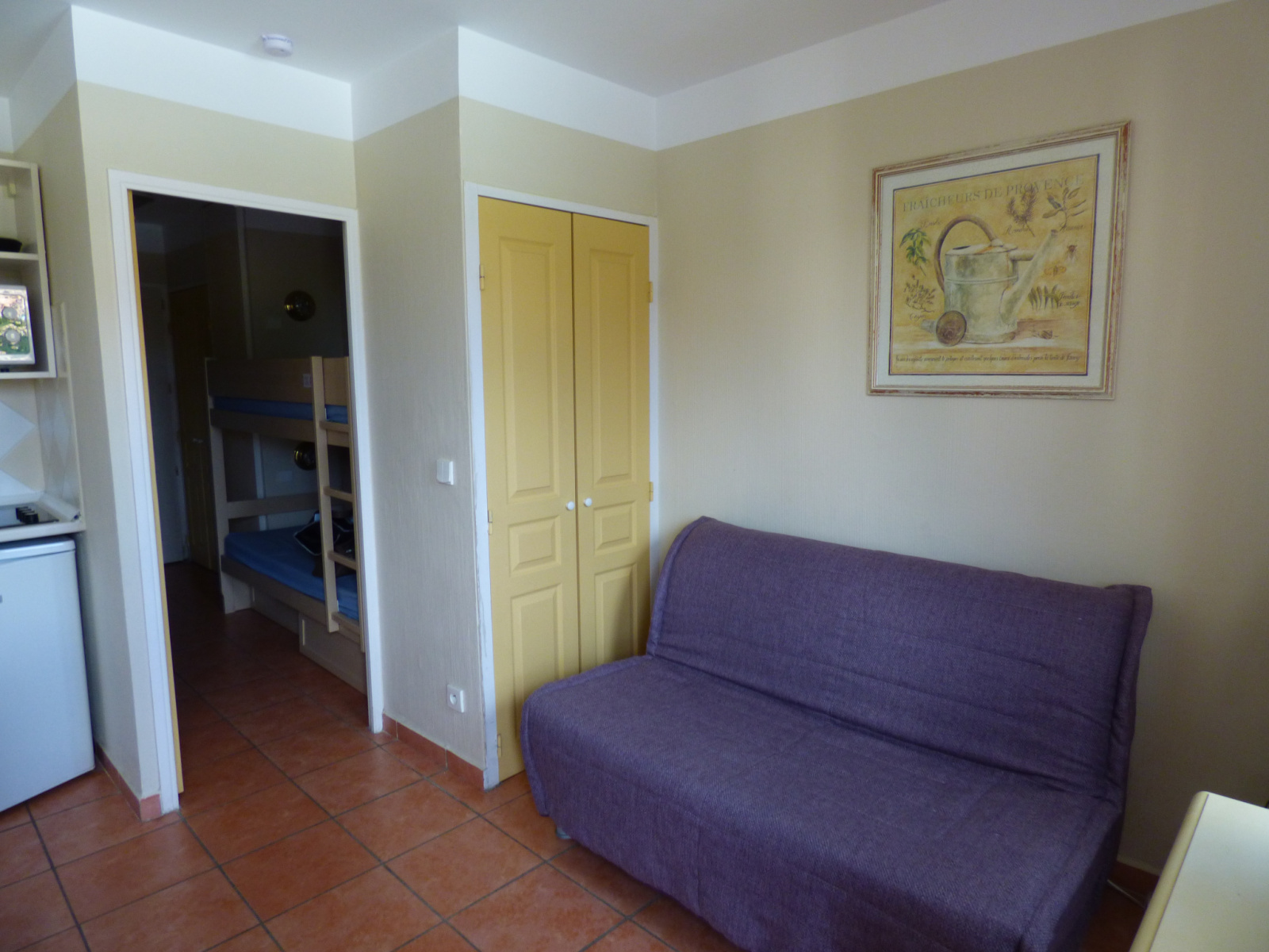 Beau studio cabine de 23 m² pour 4 personnes, situé dans domaine privé avec piscine, dernier étage, offrant: entrée cabine 2 lits superposés, séjour avec kichenette équipée, salle de bains, wc séparé. Belle terrasse. Vue dégagée sur collines et piscine.