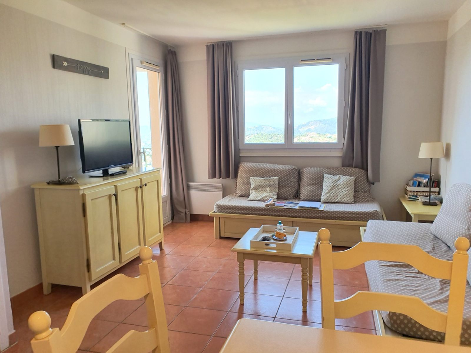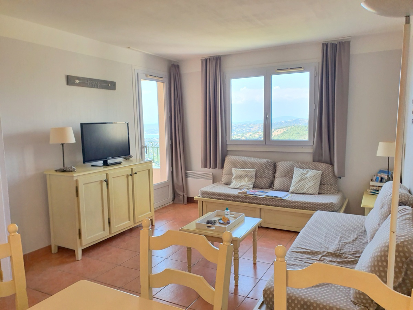 Très jolie vue mer pour cet appartement de 2 pièces principales d'une surface de 36m² comprenant: entrée, séjour avec cuisine américaine, belle chambre avec placards, salle de bains, WC séparé. terrasse - loggia vue mer sur le Golfe de saint tropez et belle vue dégagée sur les collines. Résidence avec piscine. Idéal vacances.